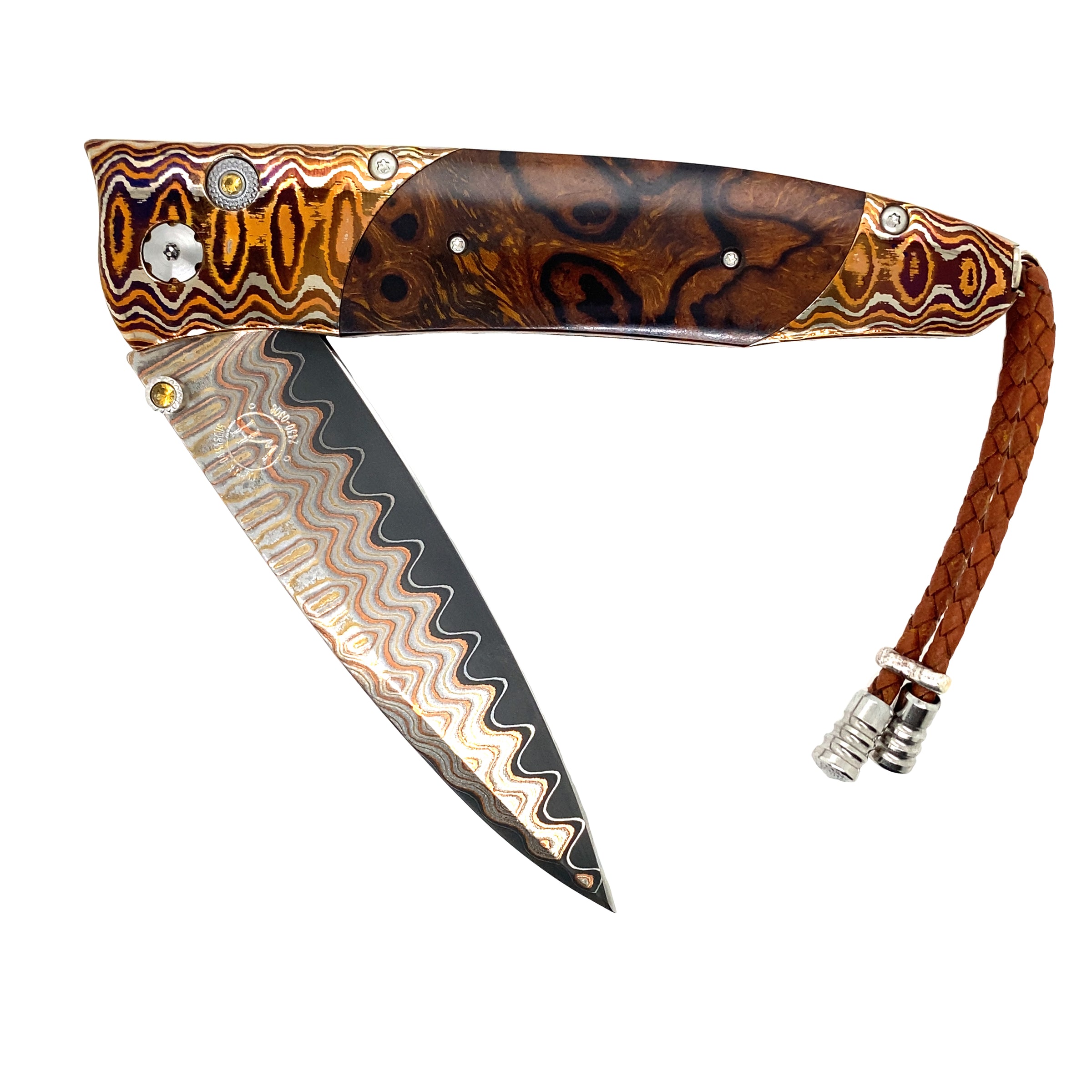 The Gentac ‘Red Sands’ features a beautiful frame in William Henry's signature 'Wave' mokume gane, inlaid with a beautiful piece of desert ironwood. The blade is 'Copper 'Wave' damascus with an extra strong core in VG-5; the one-hand button lock and the thumb stud are set with citrines. An exceptional design that offers rigorous performance in a sleek, comfortable knife, the Gentac is also the perfect canvas to showcase William Henry’s range of exotic materials and techniques. The ‘Red Sands’ features some of the exotic materials and hand-forged metals that are the hallmark of William Henry's collections; a timeless heirloom to be proudly worn and used for a lifetime before being handed-down to another generation.